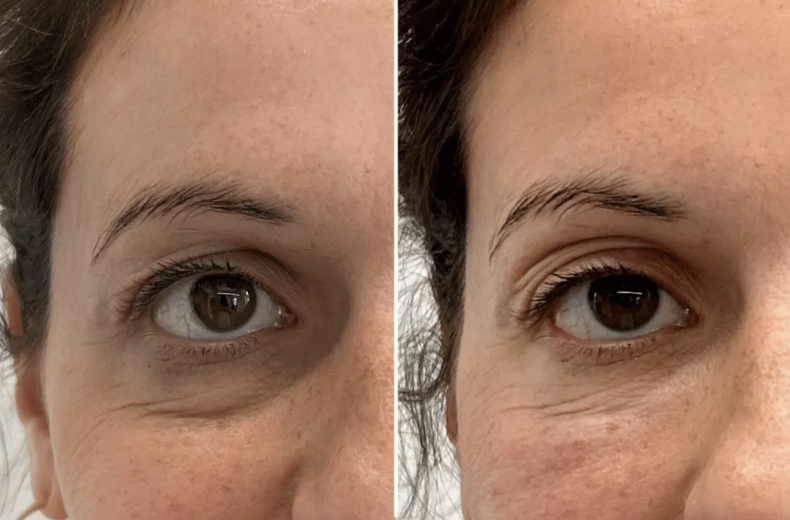 When injected under the eye (and in other parts of the face and neck), they improve skin elasticity by stimulating collagen production. They also improve skin hydration as well as the appearance of dark undereye circles. For best results, 2-3 treatments are required over a 4-6 week period. For an example of our results, see the beautiful before & after photos of our patient below: